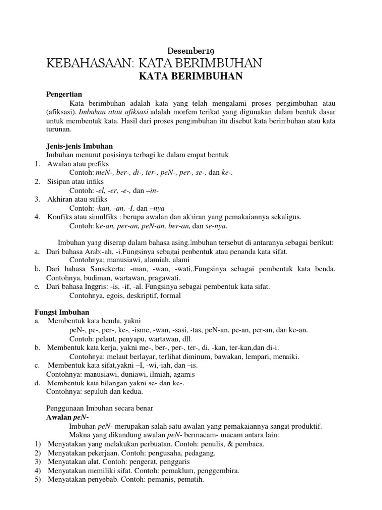 Kata berimbuhan adalah kata dasar yang mendapatkan imbuhan berupa awalan akhiran sisipan dan awalan-akhiran. Kata berimbuhan awalan sisipan akhiran serta gabungan awalan dan akhiran ditulis. A Imbuhan pe-an.